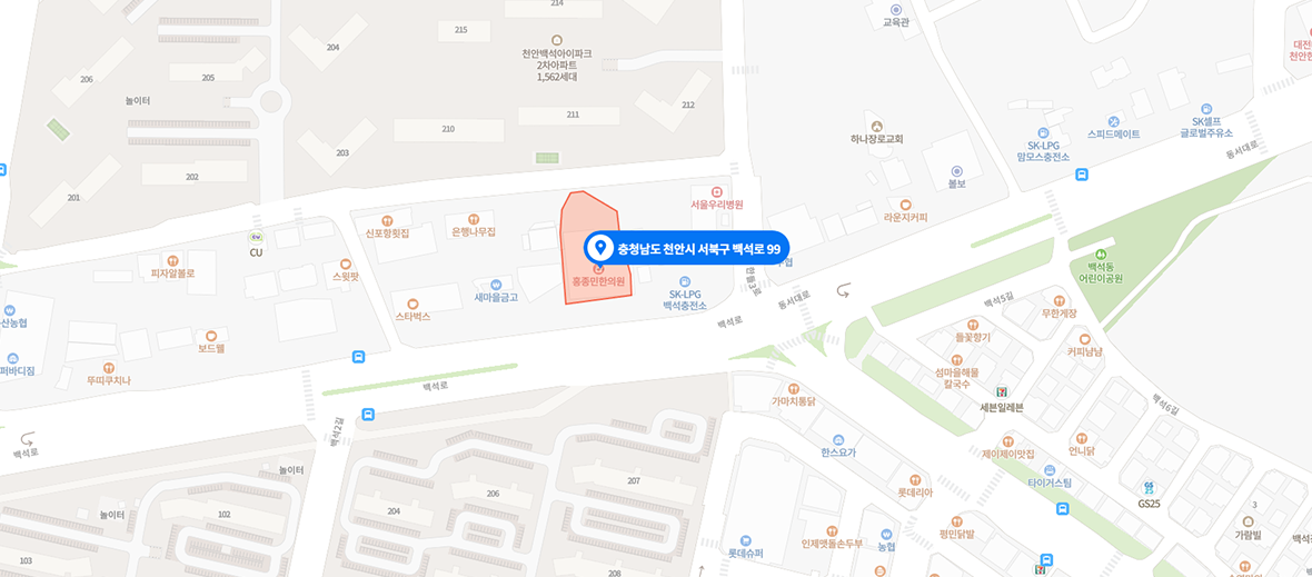 3천평 규모 백석공원 걸어서 1분,158m 높이 봉서산 등산로 걸어서 10분
